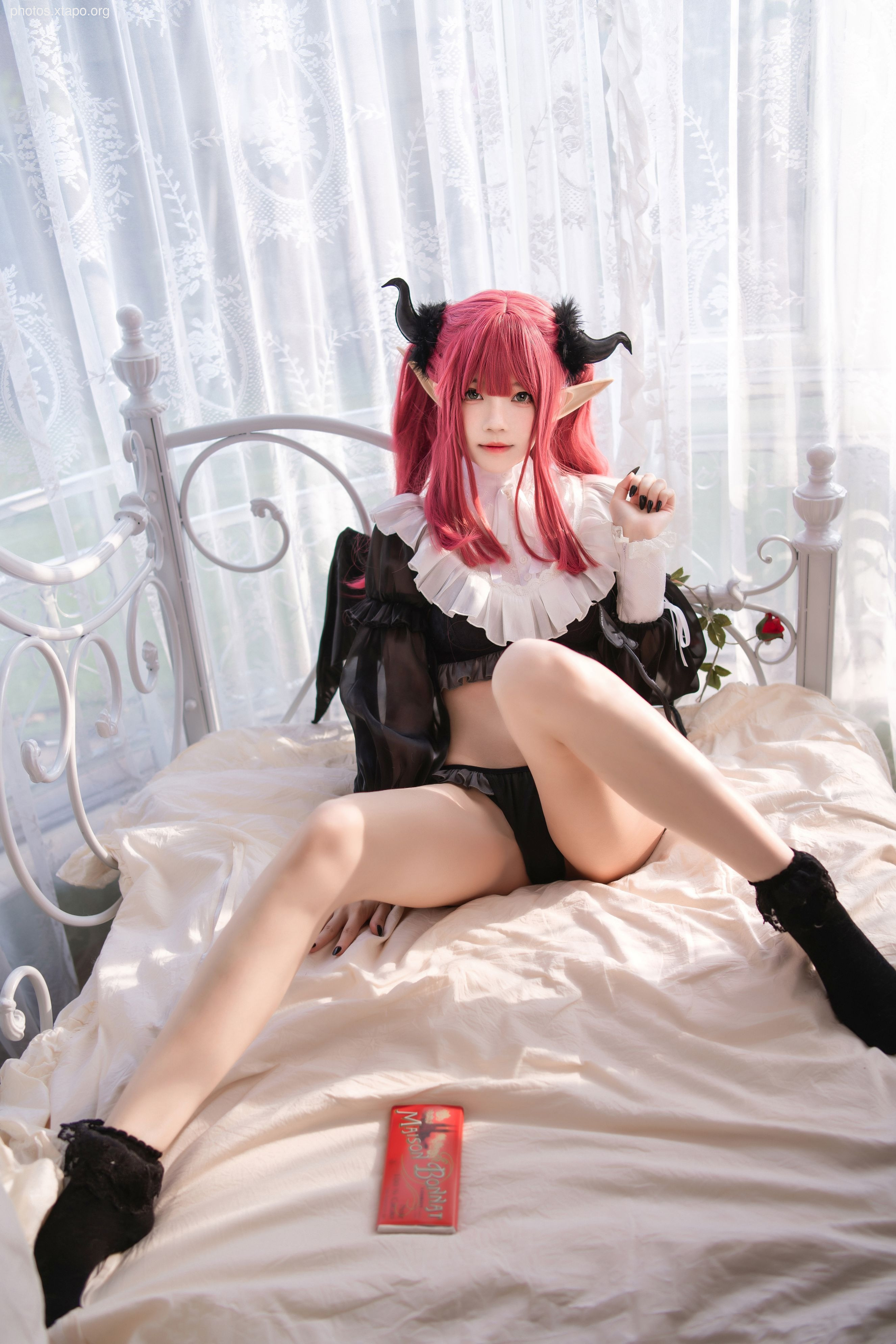 A captivating portrait of a young Asian woman, elegantly posed in delicate pink lingerie near a bright window.