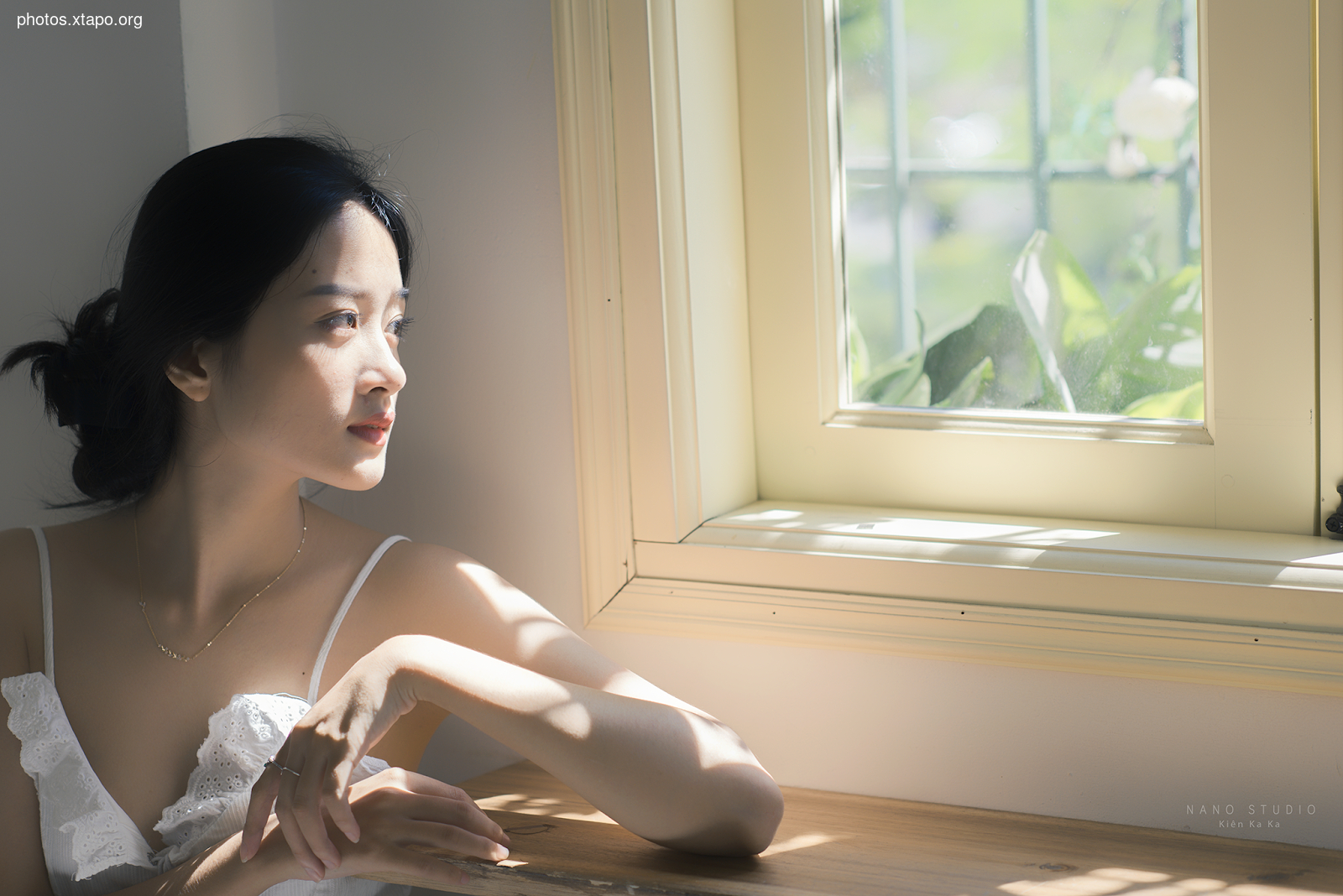A young woman in a purple and pink striped skirt and a pink shirt is leaning against a wooden desk. She is smiling slightly.