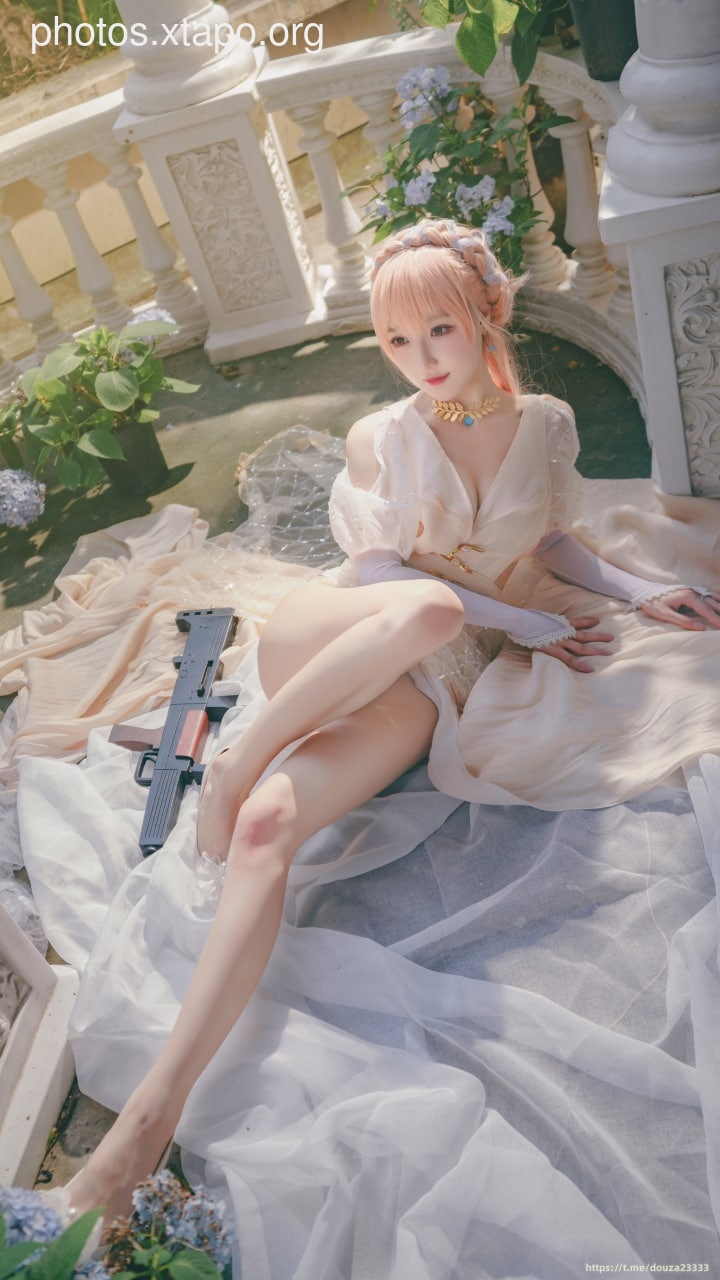A young woman in a gold bikini relaxes by the pool, enjoying the sun and the water.