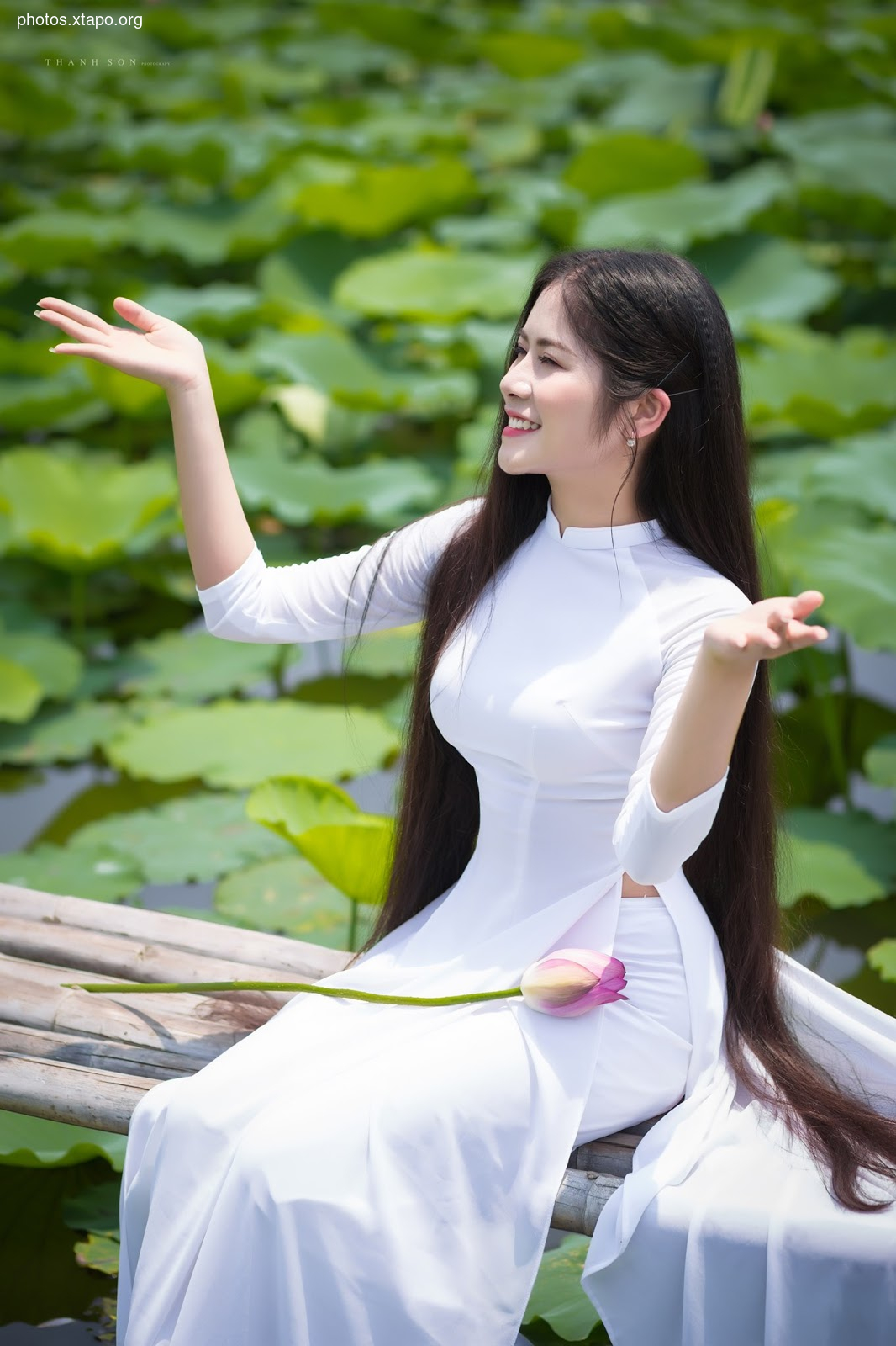 A young Asian woman with long dark hair poses in a grey dress on a tiled patio. She is smiling slightly and looking at the camera.