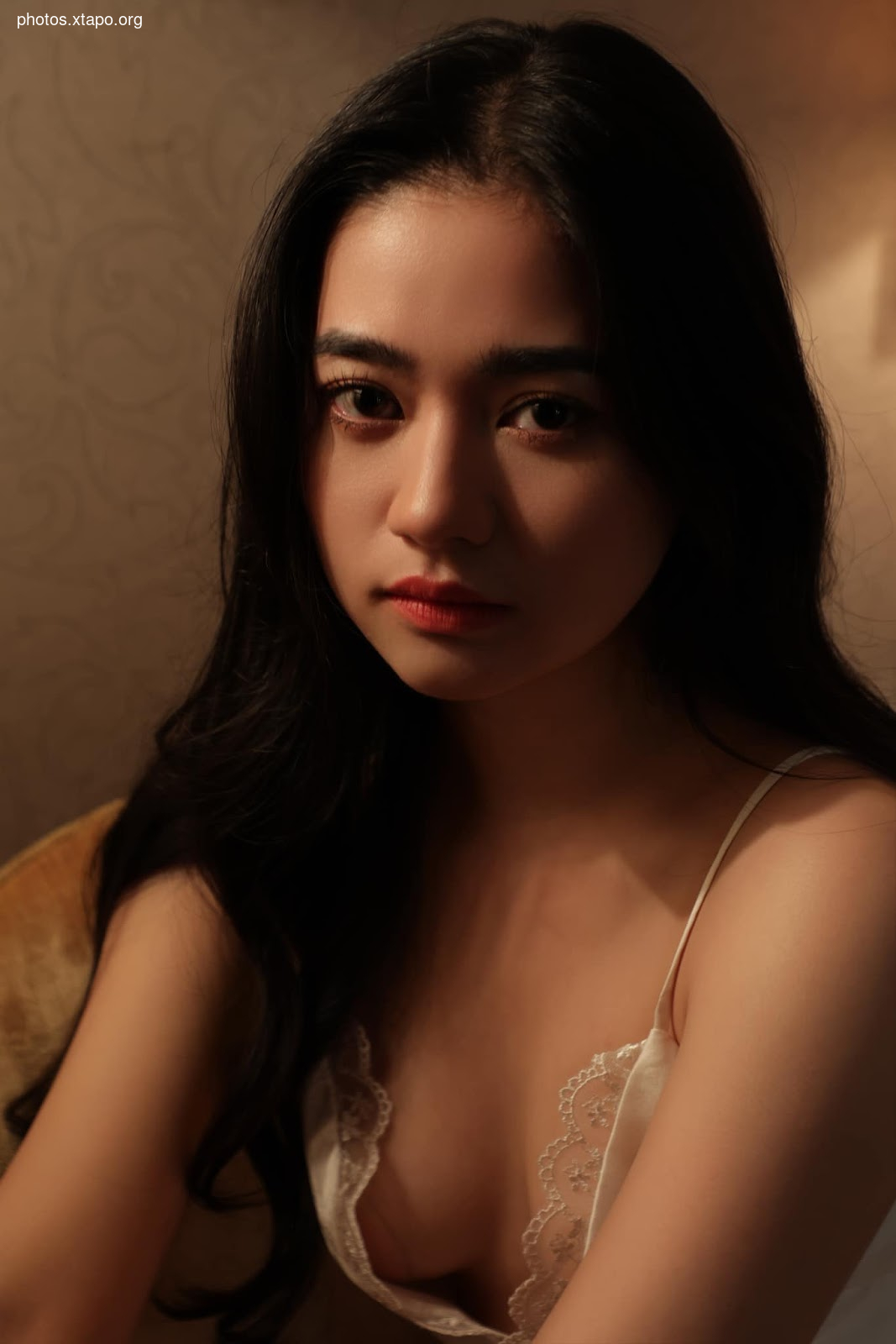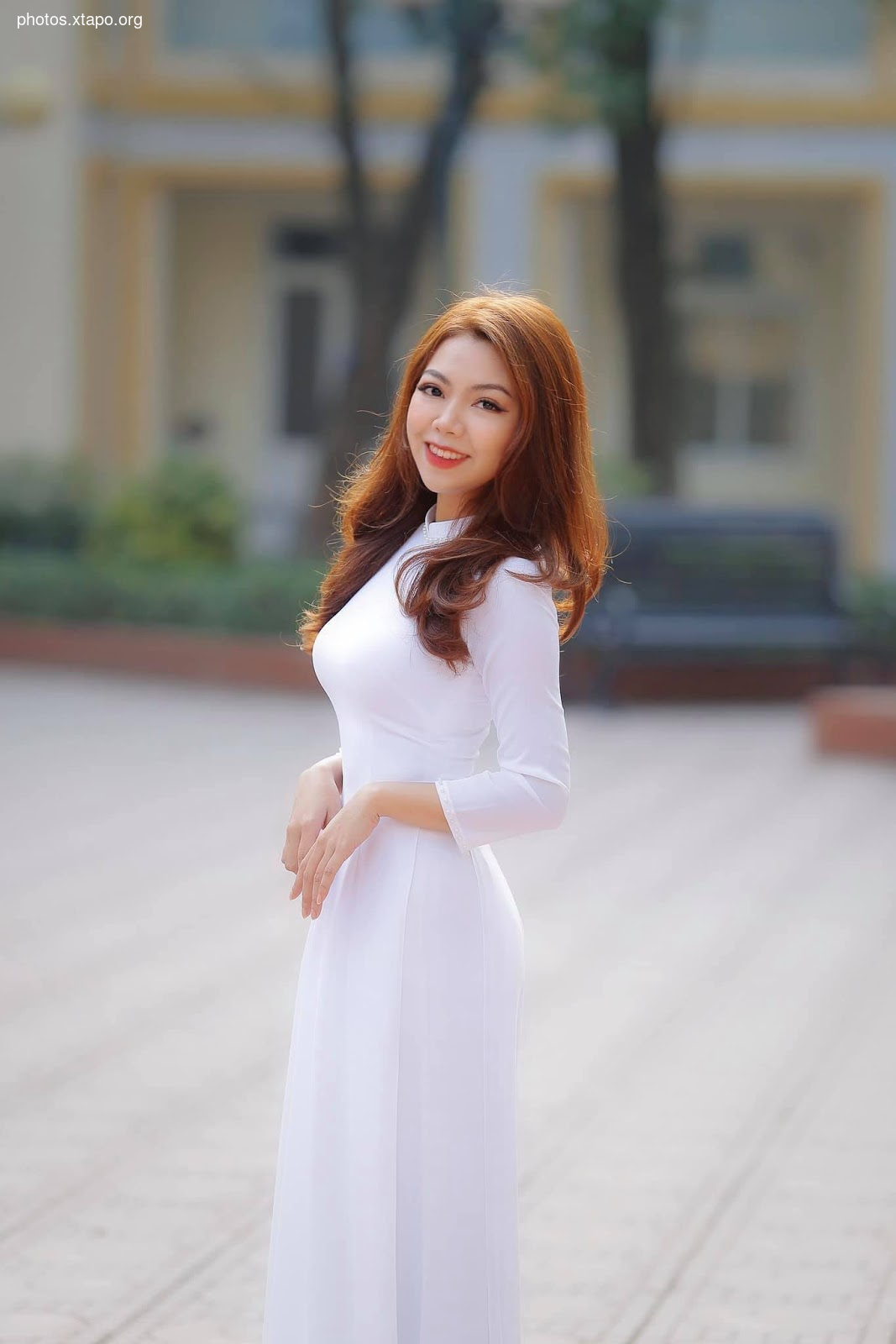 A stunning Asian woman with long brown and red hair, wearing a white off-the-shoulder dress, poses near a wooden fence adorned with lush greenery.