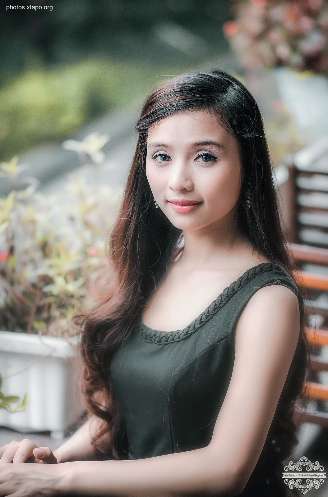 A woman with short black hair poses in a white one-shoulder dress against a tree in a park.  She is looking down.