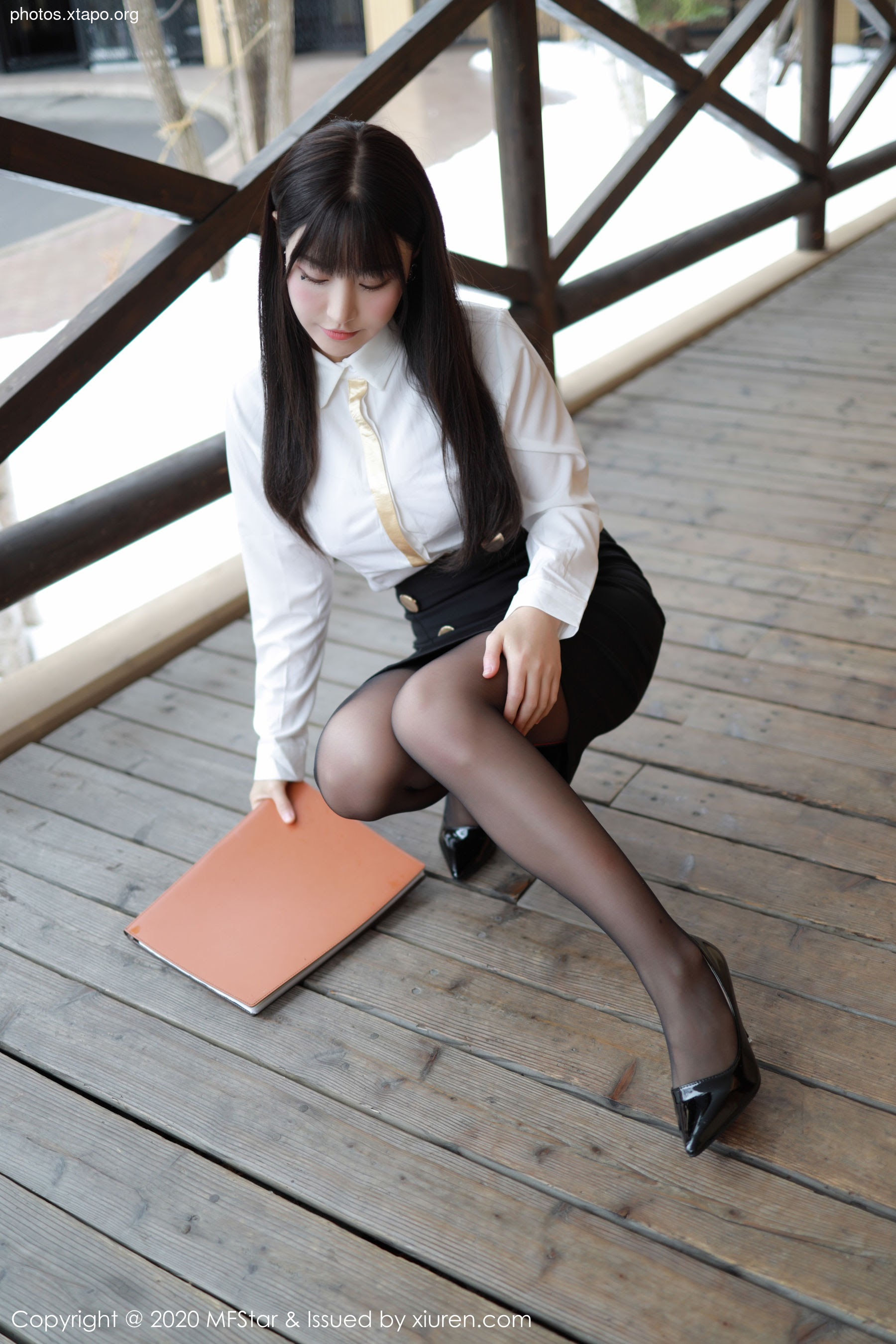 A young woman with long brown hair sits on a wooden bench amidst blooming pink flowers. She’s wearing a light blue floral dress.
