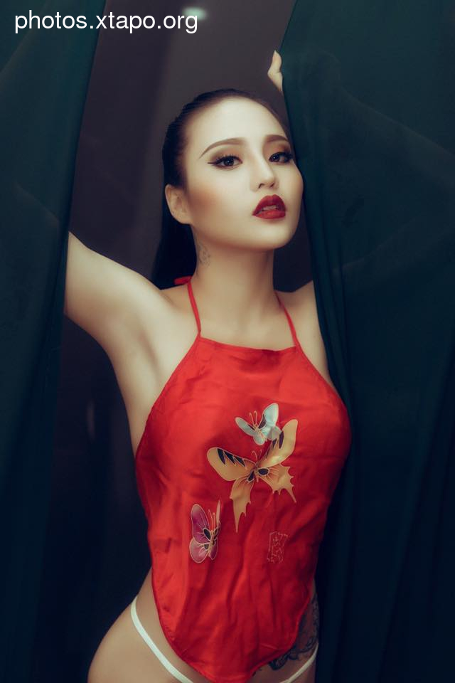 A woman in a shiny nude bodysuit poses on a couch with red and gold Chinese New Year decorations in the background. She is holding red envelopes, which are traditionally used to give money during the holiday.