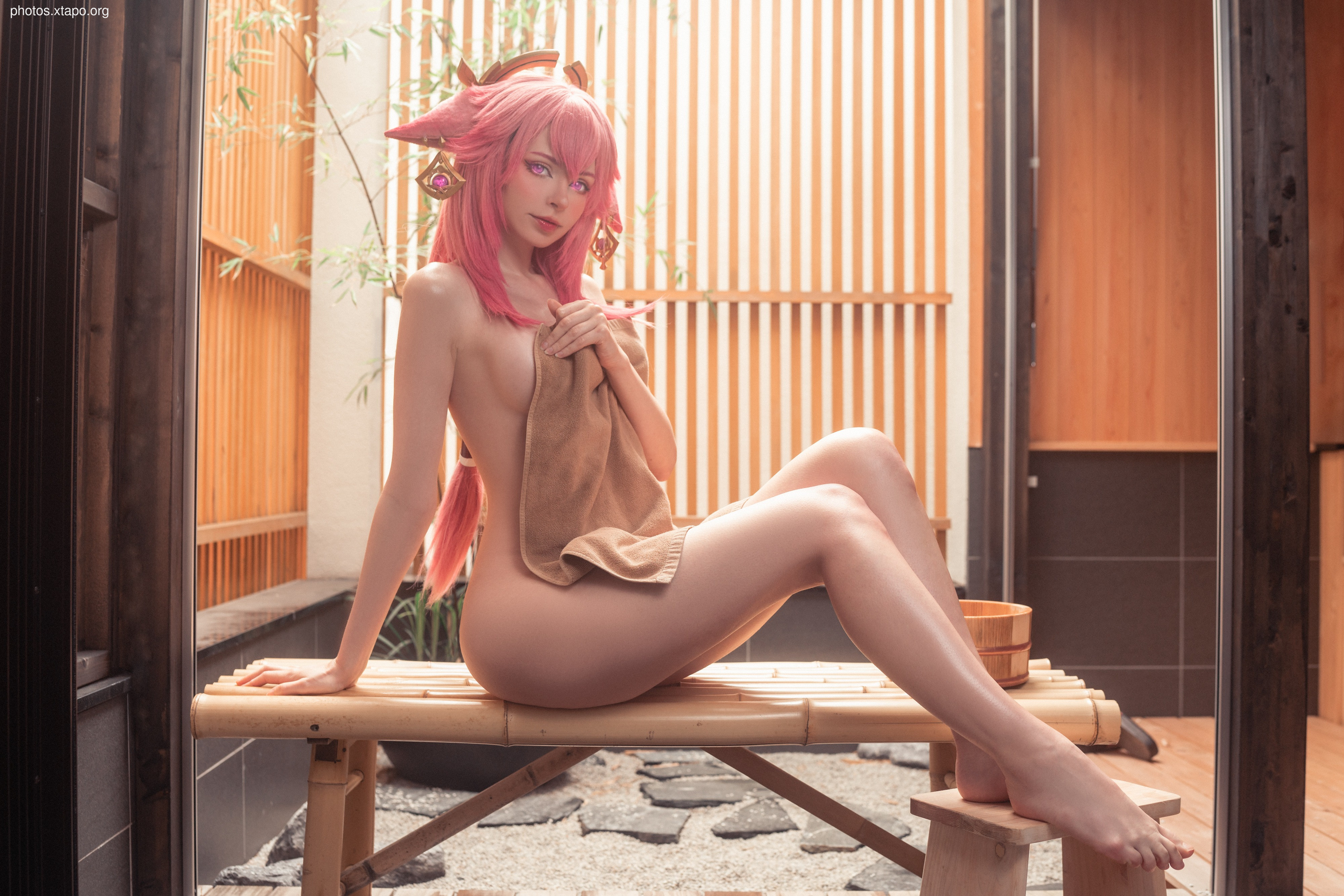 A young woman with long brown hair is lying on a bed. She is wearing a pink dress and white top. She is looking at the camera.