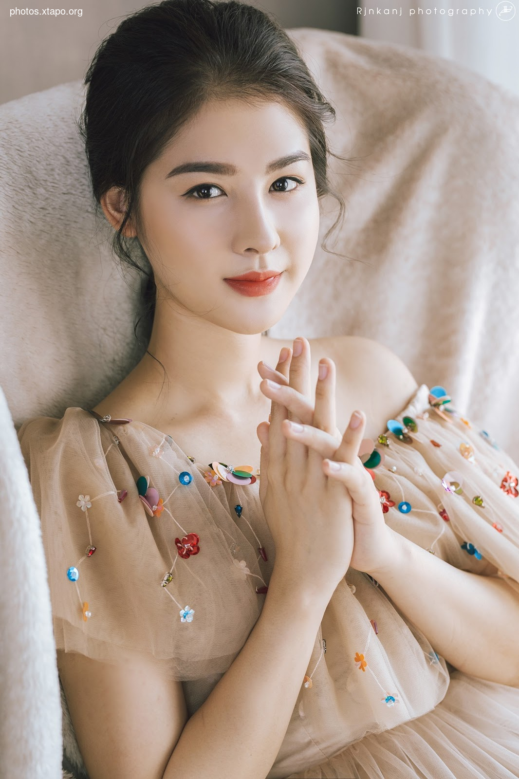 A young woman with long brown hair stands against a white background. She is wearing a black off-the-shoulder top and light blue jeans. Her arms are crossed in front of her chest.