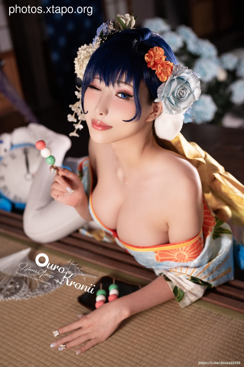 A beautiful young woman with long black hair poses in a stylish navy and white striped bodysuit. She is sitting in a modern chair in a luxury hotel setting.